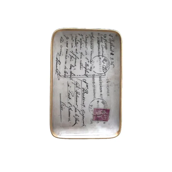 Le Plateau Solo Souvenir De Famille Nous Émerge D’Un Sentiment Nostalgique. Son Design En Forme De Carte Postale Vintage Nous Fait Voyager Dans Le Passé. Sa Bordure À La Finition Dorée À La Main Ajoute Un Aspect Raffiné. C’Est L’Accessoire Parfait Pour Mettre En Valeur Tout Ce Qui Y Est Déposé. Cet Objet Est L’Œuvre D’Un Artisan. La Finition Dorée À La Main De La Bordure Rend Chaque Pièce Unique Grâce Aux Variations De Formes Et De Coloris Des Patines Qui Peuvent Apparaître.